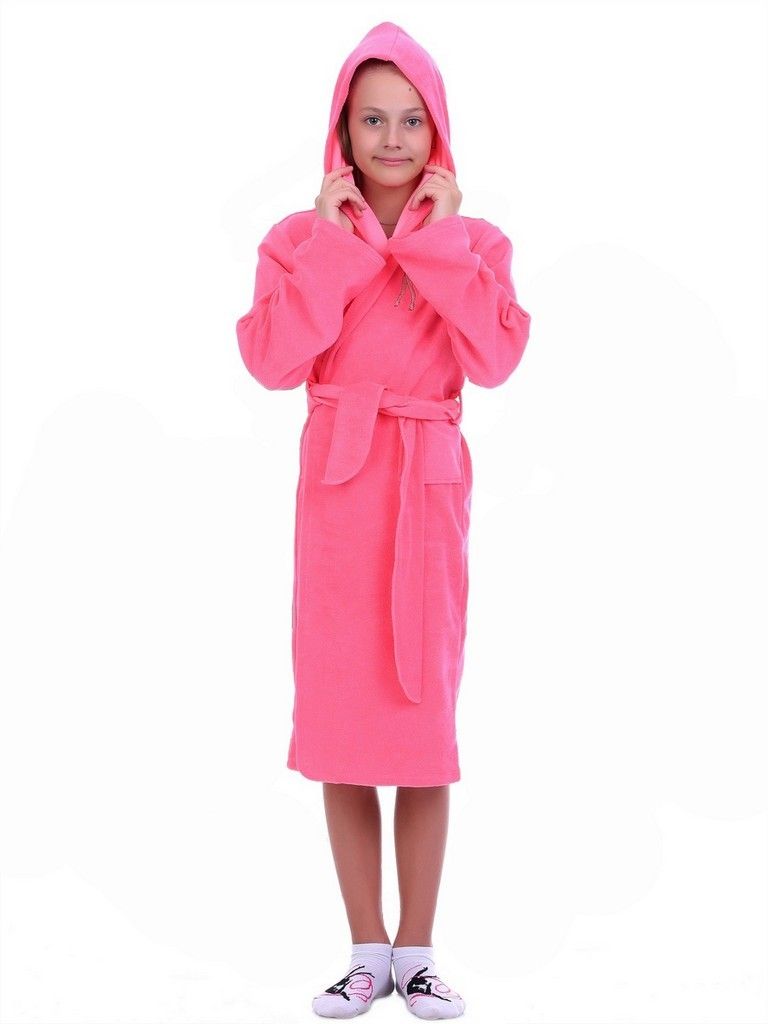 Модель халата запашная, с длинными рукавами и воротником и капюшоном, дополнена поясом на талии.